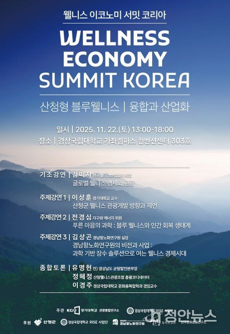 정안뉴스 김재홍 기자 | 경상국립대학교 RISE 사업단(지역연계·산청군 과제)과 경기대학교 관광종합연구소는 산청군의 웰니스 관광 발전을 위한 업무협약(MOU)을 체결하고, 그 후속 성과를 공유하고 실행 과제를 구체화할 ‘웰니스 이코노미 서밋 코리아(Wellness Economy Summit Korea)’를 11월 22일 오후 1시 가좌캠퍼스 GNU컨벤션센터 303호에서 연다.