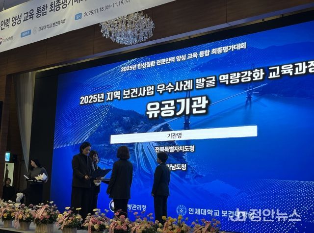 정안뉴스 안정주 기자 | 전북특별자치도가 19일 전남 여수 디오션리조트에서 개최된 질병관리청 주관 '2025년 만성질환 전문인력 양성 교육 통합 최종평가대회'에서 만성질환 전문인력 양성 교육 우수 시도로 선정됐다고 밝혔다.