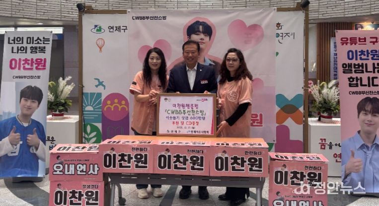 정안뉴스 황정혜 기자 | 연제구는 11월 17일 가수 이찬원 팬클럽(CWBB부산찬스방)으로부터 지역 내 어려운 이웃을 돕기 위한 성금 600만 원을 전달받았다.
