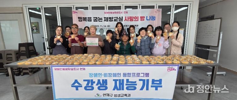 정안뉴스 황정혜 기자 | 연제구는 11월 14일 아델라디저트아카데미학원에서 장애인과 장애인 가족들로 구성된 수강생들이 2달여 간 배운 제빵 기술로 앙금 소보루빵 100개를 만들어 장애인직업재활시설부산직업재활원 장애인 근로자에게 전달하는 행복을 굽는 제빵교실 ‘사랑의 빵’ 나눔을 진행했다고 밝혔다.