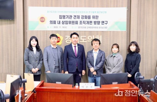 정안뉴스 안정주 기자 | 경기도의회 자치분권발전위원회 총무행정분과 이은주 위원장(국민의힘, 구리2)은 11월 19일, 「집행기관 견제 강화를 위한 의회 내 상임위원회 조직개편 방향 연구」 중간보고회를 주재했다. 이번 회의는 지난 9월 29일 열린 착수보고회 이후 연구 추진 경과를 점검하고, 향후 연구 방향을 구체화하기 위해 마련됐다.