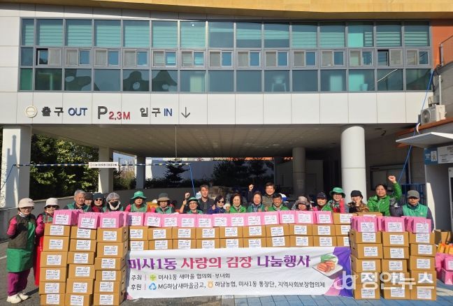 정안뉴스 안정주 기자 | 하남시 미사1동 새마을협의회(회장 김성호)와 부녀회(회장 유정자)는 2025년 11월 19일, 본격적인 겨울을 맞아 관내 소외계층 100가구에 전달할 ‘사랑의 김장김치 나눔 행사’를 성황리에 진행했다.