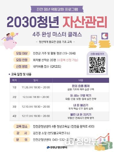 정안뉴스 황은경 기자 | 충북 진천군 청년센터는 지역 청년들의 안정적인 자산 형성과 금융 역량 강화를 위해 ‘청년 자산관리 4주 완성 마스터 클래스’를 운영한다고 20일 밝혔다.