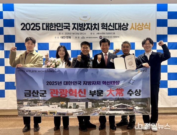 정안뉴스 황도연 기자 | 금산군은 20일 서울시 강남구 논현동 건설회관에서 열린 2025 대한민국 지방자치 혁신대상 시상식에서 관광혁신부문 대상을 받았다.