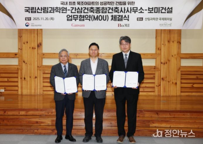 정안뉴스 안정주 기자 | 산림청 국립산림과학원은 20일, 간삼건축종합건축사사무소, 보미건설과 함께 국내 최초 목조아파트 건립을 위한 업무협약을 체결했다고 밝혔다.