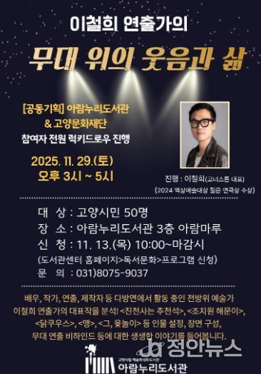 정안뉴스 안정주 기자 | 고양특례시 아람누리도서관은 오는 29일 오후 3시, 2024년 제60회 백상예술대상 젊은 연극상 수상자인 이철희 연출가를 초청해 예술특성화 프로그램 ‘무대 위의 웃음과 삶’을 운영한다.