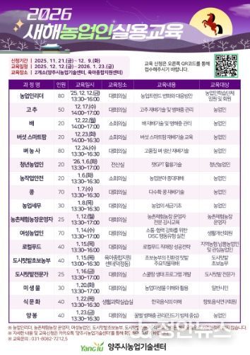 양주시농업기술센터 관계자는“새해농업인실용교육은 농업인의 현장 실천 능력을 높이는 핵심 프로그램으로, 변화하는 농업환경에 대비하고 지역농업 경쟁력을 강화하는 데 큰 도움이 될 것”이라고 말했다.