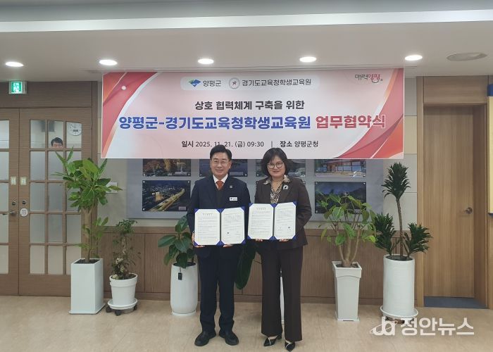 정안뉴스 안정주 기자 | 경기도교육청학생교육원이 21일 양평군청(군수 전진선)과 미래형 교육환경 조성 및 지역 사회에 기반한 상호 협력체제 구축을 위한 업무협약을 체결했다.