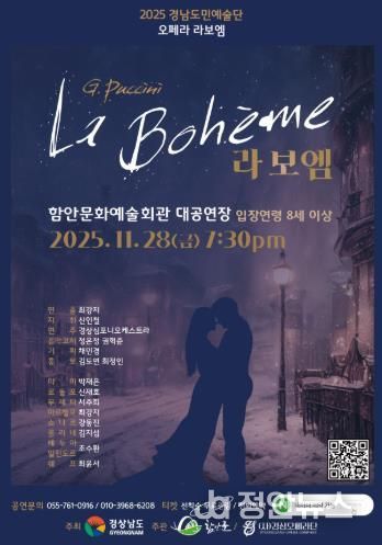 정안뉴스 김재홍 기자 | 함안군은 푸치니의 대표작 오페라 〈라 보엠〉을 오는 2025년 11월 28일 오후 7시 30분, 함안문화예술회관 대공연장에서 전석 무료로 선보인다고 밝혔다.