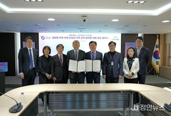 정안뉴스 안정주 기자 | 대구 수성구는 지난 19일 태재대학교(총장 염재호)와 글로벌 미래 인재 양성 및 지역 교육 발전을 위한 업무 협약(MOU)을 체결하고 상호 협력 체계를 구축했다고 밝혔다.