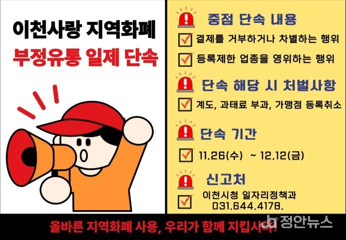정안뉴스 안정주 기자 | 이천시는 경기이천사랑지역상품권의 올바른 사용 환경을 조성하고 건전한 유통 질서를 확립하기 위해 11월 26일부터 12월 12일까지 지역사랑상품권 부정유통 근절을 위한 일제 단속을 추진한다고 밝혔다.