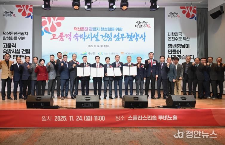 정안뉴스 황도연 기자 | 예산군은 24일 충청남도, 충남개발공사, ㈜호반호텔앤리조트와 함께 덕산온천관광지에 고품격 숙박시설 및 컨벤션 기능을 갖춘 복합 휴양시설 건립을 위한 업무협약(MOU)을 체결했다.