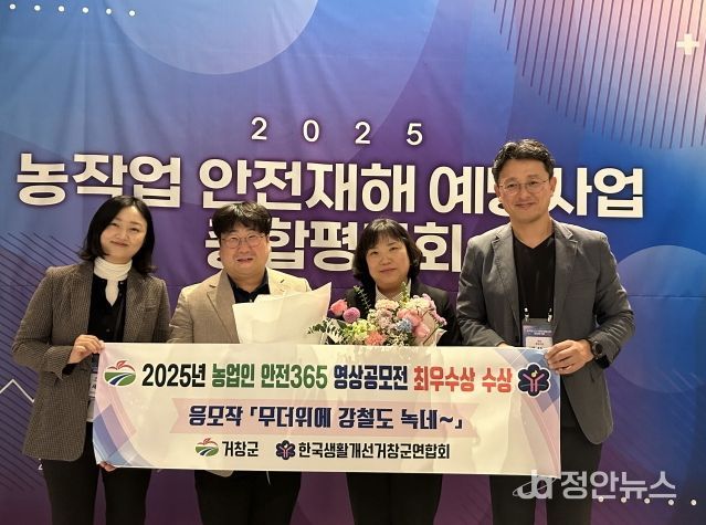 정안뉴스 김재홍 기자 | 거창군은 지난 20일 농촌진흥청이 주최한 ‘2025년 농작업 안전재해 예방사업’ 종합 평가회에서 안전 365 캠페인 영상공모전에 한국생활개선거창군연합회(회장 윤진미)와 관의 협력으로 만든 영상이 최우수상을 수상했다고 밝혔다.