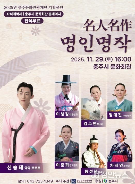 정안뉴스 황은경 기자 | 충주문화관광재단은 오는 29일 오후 4시 충주문화회관에서 대한민국을 대표하는 국악 명인들을 중심으로한 기획국악공연‘名人名作(명인명작)’을 선보인다.