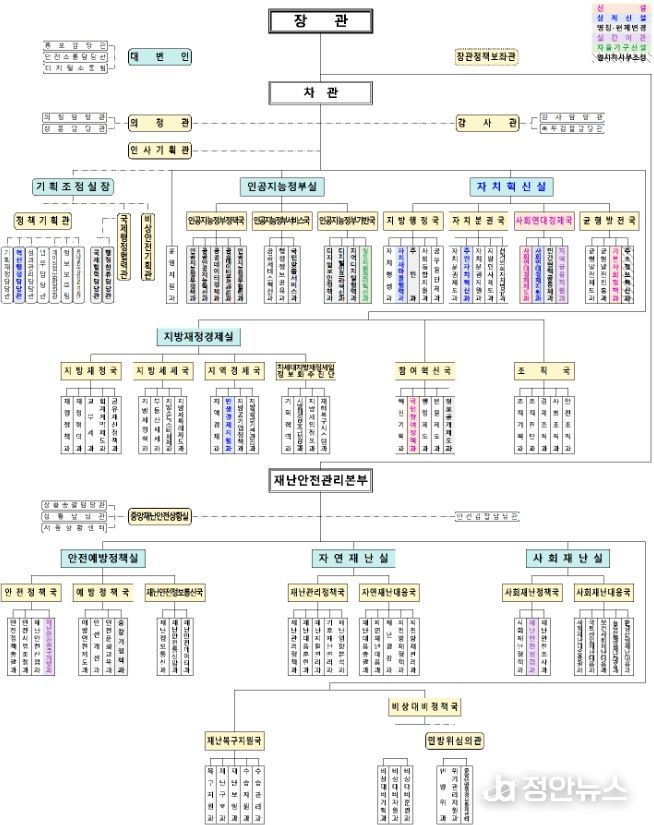 정안뉴스 안정주 기자 | 행정안전부는 인공지능(AI), 지방정부 및 국민안전 정책 수준을 한단계 더 높이고, 국정과제 추진동력을 강화하기 위한 조직개편을 실시했다고 밝혔다.