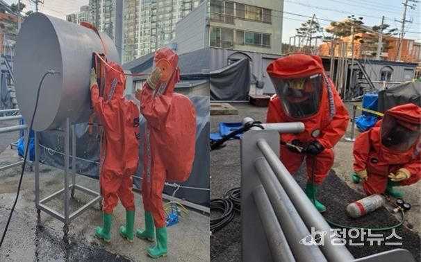 주요 훈련 내용은 ▲화학사고 대응 이론 및 안전관리 교육 ▲화학사고 대응키트를 활용한 누출 차단 실습 ▲유해화학물질 성상 파악 및 초기 제독 조치 ▲A·C급 화학보호복 착·탈의 숙달 ▲누출 현장 위험 요소 분석 및 주변 확산 통제 등이다.