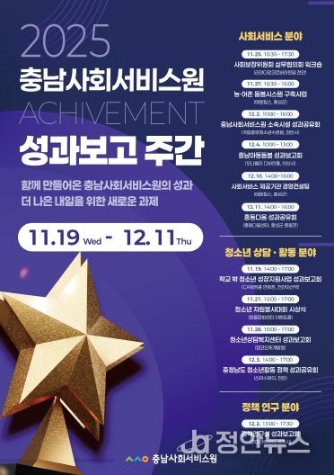 정안뉴스 황도연 기자 | 충남사회서비스원(원장 김영옥)이 오는 11월 19일부터 12월 11일까지를 ‘2025 사회서비스원 성과보고 주간’으로 지정하고, 올해 추진한 사회서비스·청소년·정책연구 등 3개 분야에서 총 11개의 주요 사업 성과를 도민에게 공개하는 대규모 홍보 기간에 들어간다.