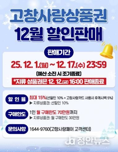 정안뉴스 안정주 기자 | 고창군이 연말 지역 소비 촉진과 소상공인 매출 증대를 위해 12월 고창사랑상품권을 최대 15% 할인율로 판매한다고 1일 밝혔다.