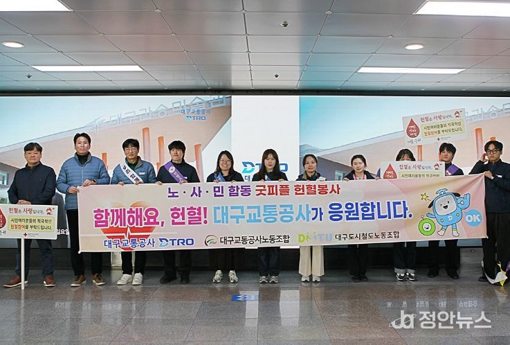 정안뉴스 안정주 기자 | 대구교통공사는 지난 11월 27일 상인동 본사와 월배·문양·칠곡경전철 차량기지 등 총 4개 사업장에서 ‘노·사·민이 함께하는 생명 나눔 헌혈행사 및 헌혈 참여 캠페인’을 진행했다.