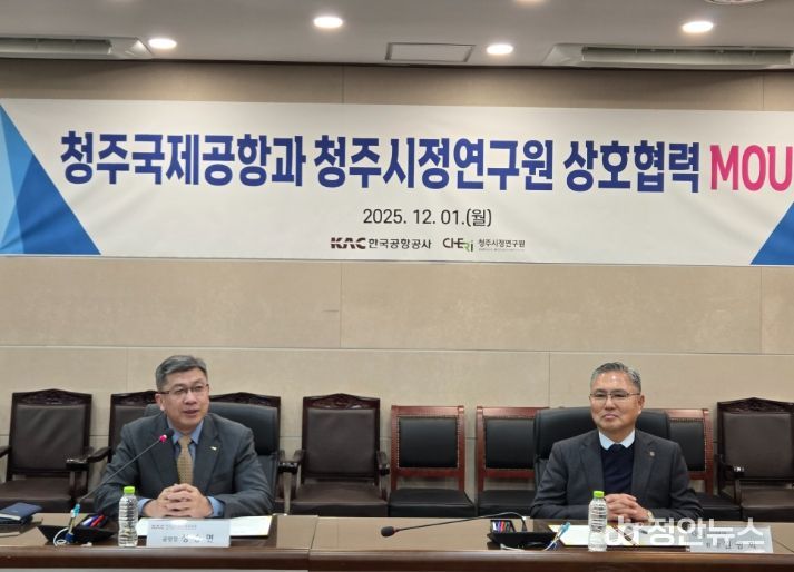 정안뉴스 황은경 기자 | 청주시정연구원과 한국공항공사 청주공항 은 1일 청주공항에서 지역 교통·관광·산업 활성화 및 공항 운영 기능 강화를 위한 상호 협력 업무협약(MOU)을 체결했다.