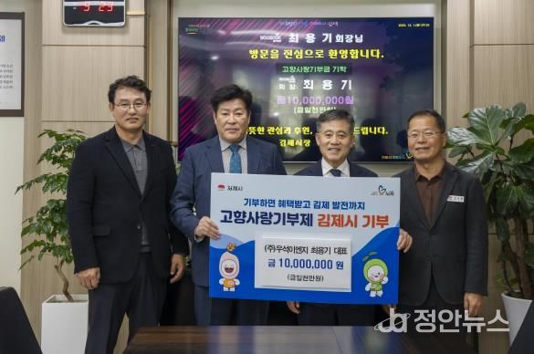 정안뉴스 안정주 기자 | 김제시는 2일 ㈜우석이엔씨 최용기 회장이 김제시 고향사랑기부제에 1,000만원을 기탁했다고 밝혔다.