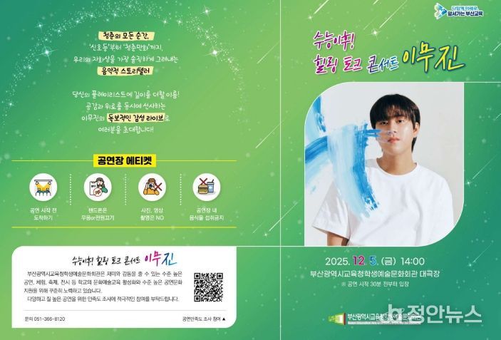 정안뉴스 황정혜 기자 | 부산광역시교육청학생예술문화회관(관장 박은혜)은 오는 5일 오후 2시 학생예술문화회관 대극장에서 수능을 마친 고3 학생 700여 명을 대상으로 가수 이무진과 함께하는 ‘수능 이후! 힐링 토크 콘서트’를 개최한다.