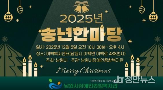 정안뉴스 안정주 기자 | 남원시장애인종합복지관이 오는 12월 5일 오전 10시 30분, 이백복지센터(이백로 488)에서 '2025년 남원시장애인종합복지관 송년한마당'을 개최한다.