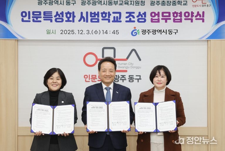 정안뉴스 안정주 기자 | 광주 동구는 2026년 새롭게 기획한 인문특성화 학교 추진을 위해 지난 3일 광주동부교육지원청, 광주충장중학교와 ‘인문 특성화 시범학교 운영을 위한 업무협약’을 체결하고 지역 인문교육 활성화를 위한 협력 기반을 구축했다고 밝혔다.