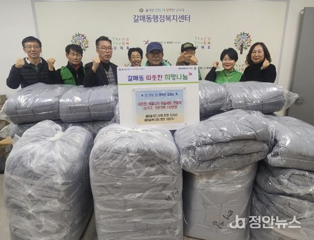 정안뉴스 안정주 기자 | 구리시는 지난 3일 오후 4시 갈매동 행정복지센터에서 갈매동 새마을지도자회와 새마을부녀회가 에너지 취약계층 30가구에 130만 원 상당의 친환경 겨울 이불 30세트를 지원했다고 밝혔다.