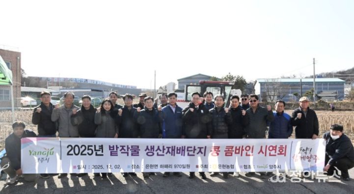 정안뉴스 안정주 기자 | 양주시가 지난 2일 은현면 하패리에서 은현농협 조합원 20여 명과 함께 ‘2025년 밭작물 생산·재배단지 조성사업 콩 콤바인 시연회'를 열었다.