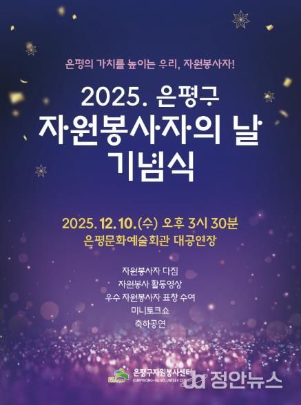정안뉴스 안정주 기자 | 서울 은평구는 오는 10일 은평문화예술회관 대공연장에서 ‘2025 자원봉사자의 날 기념식’을 개최한다고 밝혔다.