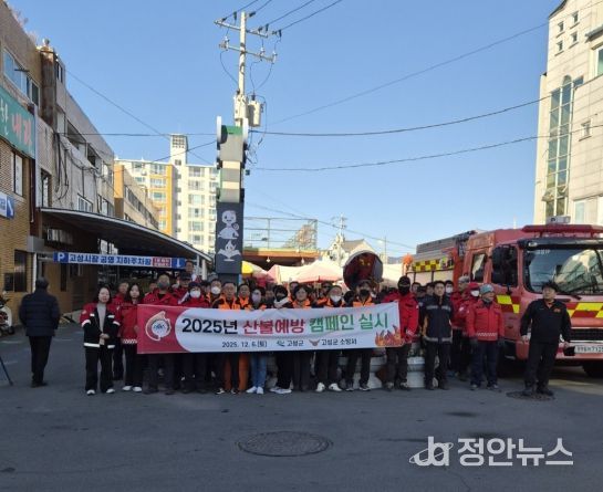 정안뉴스 김재홍 기자 | 고성군은 12월 6일, 고성읍 고성시장에서 군청 녹지공원과,고성소방서, 산불전문예방진화대, 소방의용대 등 60여 명이 함께 2025년 경상남도 동시 산불예방 캠페인을 벌였다.