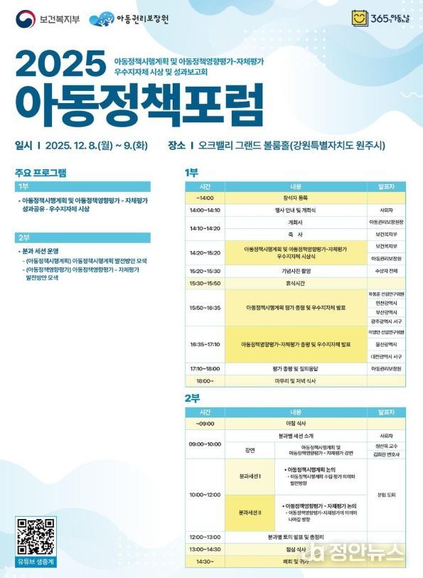 정안뉴스 안정주 기자 | 보건복지부와 아동권리보장원(원장 정익중)은 12월 8일 14시 오크밸리 그랜드볼룸 홀(강원도 원주)에서 '2025년 아동정책포럼'을 개최한다.