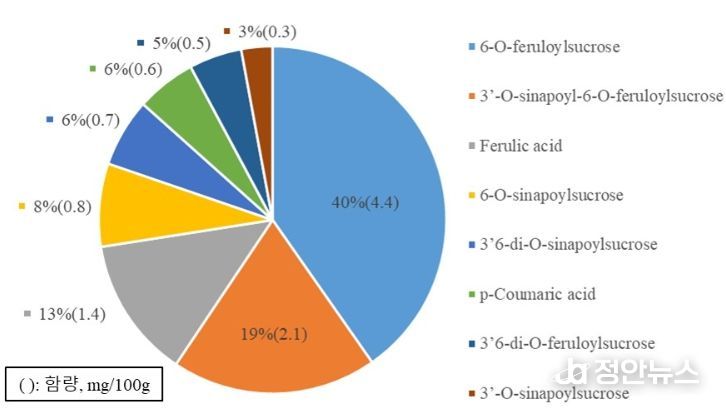 농촌진흥청 식생활영양과 연구진의 정밀 분석 결과, 국산 현미(‘삼광’)에서 총 8종의 페놀산 성분을 확인했으며, 이 중 6종이 배당체 형태로 밝혀졌다. 그 중 ‘6-O-페룰로일슈크로스(6-O-feruloylsucrose)’가 총 페놀산 함량의 약 40%(100g 당 생중량, 4.4mg)를 차지하는 가장 중요한 성분으로 확인됐다. 특히, ‘3′-O-시나포일슈크로스(3′-O-sinapoylsucrose)’는 세계 최초로 현미에서 존재가 확인됐다.
