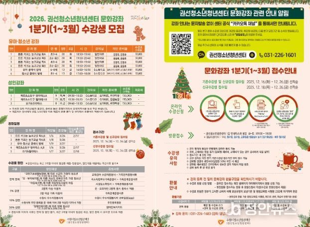정안뉴스 안정주 기자 | 수원시청소년청년재단 권선청소년청년센터는 오는 1월 6일부터 3월 27일까지 지역사회 평생학습 문화강좌 1분기(1~3월) 수강생을 모집한다.