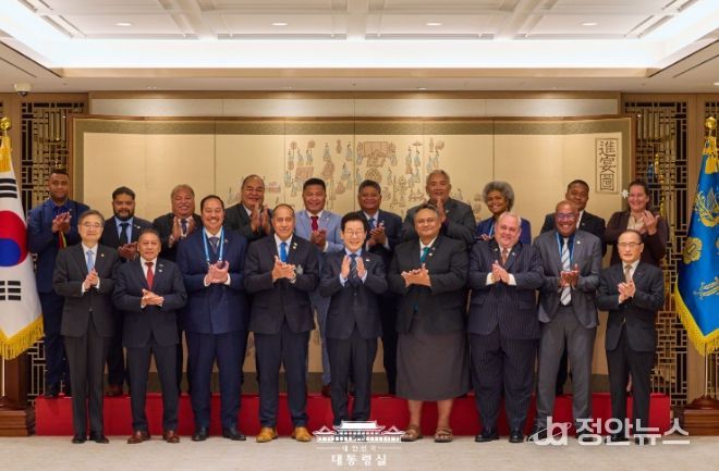 정안뉴스 안정주 기자 | 이재명 대통령은 12월 10일 오전, 대통령실에서 제6차 한-태평양도서국 외교장관회의 참석을 위해 방한한 태평양도서국 외교장관 일행을 접견했다.