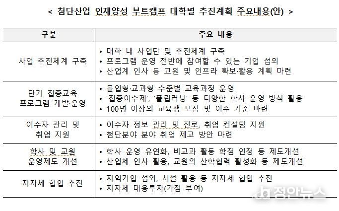 ‘첨단산업 인재양성 부트캠프’는 다양한 배경의 학생들이 대학과 기업이 공동으로 개발·운영하는 1년 이내 단기 집중교육을 통해 첨단분야 산업에 진출할 수 있도록 기획됐다. 2023년 반도체 분야 10개교를 시작으로, 2024년 이차전지, 디스플레이, 바이오, 항공우주 등 다양한 첨단분야로 확대하여 총 42교를 지원했다. 2025년에는 미래차, 인공지능(AI) 분야까지 확대하여 총 7개 분야, 47개교를 지원하고 있다.