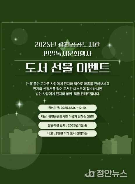 군에 따르면 오는 19일까지 3층 종합자료실에서 이용자 30명을 선착순으로 도서 선물 이벤트를 접수한다. 한 해 동안 고마운 사람을 생각하며 편지와 함께 책 선물로 마음을 전하는 행사이며 도서관에서 제공되는 편지지와 신청서를 작성하여 데스크에서 접수할 수 있다. 2만원 한도 내에서 원하는 도서를 선물 가능하며, 도서비와 배송료는 도서관에서 부담한다.