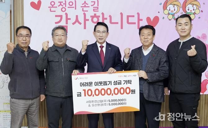 정안뉴스 황도연 기자 | 충남 서산시는 15일 생활폐기물 수집·운반 대행업체인 서청환경산업㈜과 오산환경㈜이 어려운 이웃돕기 성금 총 1,000만 원을 기탁했다고 밝혔다.