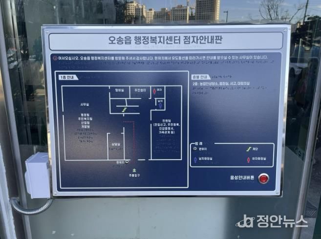 정안뉴스 황은경 기자 | 청주시는 장애인의 시설 접근성과 이용 편의성을 높이기 위해 읍·면·동 행정복지센터 17개소에 점자 안내판을 새롭게 설치했다고 17일 밝혔다.