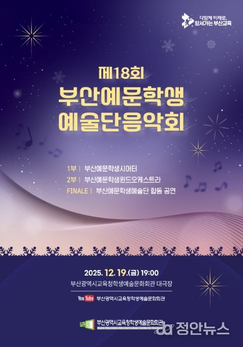 정안뉴스 황정혜 기자 | 부산광역시교육청 학생예술문화회관은 19일 오후 7시 회관 대극장에서 ‘제18회 부산예문학생예술단음악회’를 개최한다.