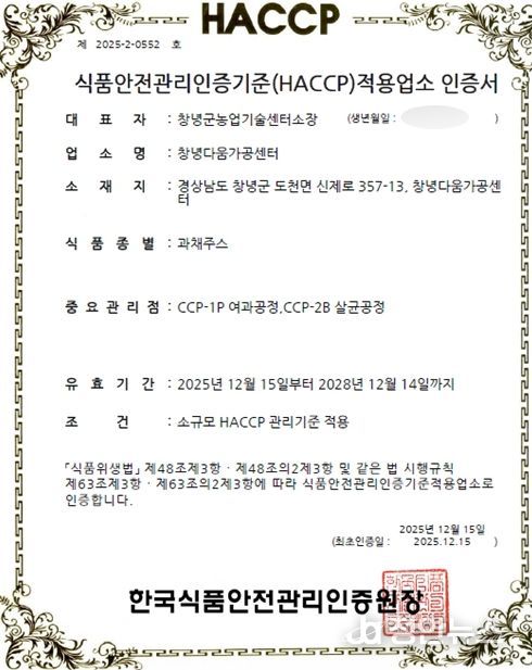 창녕다움가공센터,과채주스 식품안전관리인증기준(HACCP) 인증 획득하다