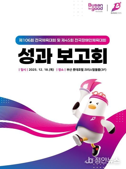 정안뉴스 황정혜 기자 | 부산시는 지난 10~11월 부산 전역에서 개최된 '제106회 전국체육대회'와 '제45회 전국장애인체육대회'의 성공적 개최를 기념하고, 대회의 성과를 돌아보는 성과보고회를 오늘(18일) 오전 11시 롯데호텔 서면에서 개최한다고 밝혔다.