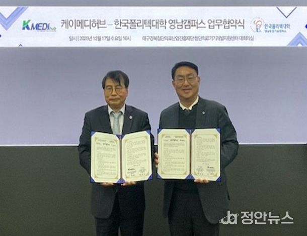 정안뉴스 안정주 기자 | 케이메디허브 첨단의료기기개발지원센터는 12월 17일 오후, 한국폴리텍대학 영남융합기술캠퍼스와 인력양성 협력을 위한 업무협약을 체결했다.