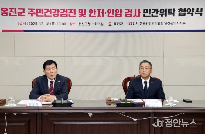 정안뉴스 안정주 기자 | 옹진군은 12월 18일 한국건강관리협회 인천광역시지부와 ‘옹진군 주민 건강검진 및 안저·안압 검사 위·수탁 협약’을 체결하고, 주민 대상 종합건강검진 사업을 본격 추진한다.