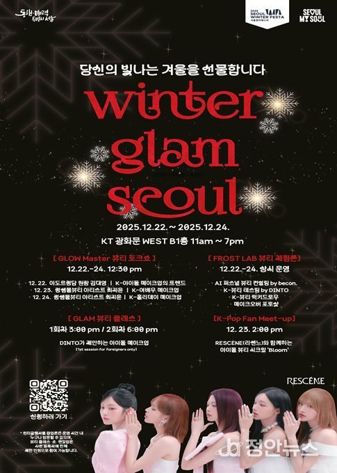정안뉴스 안정주 기자 | 서울시가 서울윈터페스타를 찾은 국내외 관광객에게 차별화된 한류 경험을 제공하기 위해 K-뷰티를 주제로 한 ‘윈터 글램 서울(Winter Glam Seoul)’ 팝업 행사를 12월 22일부터 24일까지 3일간 개최한다.