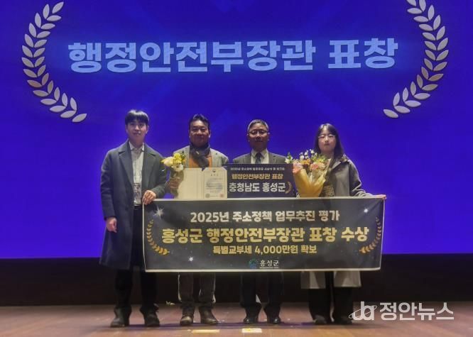 정안뉴스 황도연 기자 | 충청남도 홍성군이 지난 18일 행정안전부 주관 ‘2025년 주소정책 업무추진’ 평가에서 2010년, 2015년, 2018년에 이어 2025년에도 우수기관으로 선정되며 지역사회의 도로명주소 활용 및 관리 역량을 한 단계 끌어올린 성과를 인정받아 행정안전부 장관 표창과 특별교부세 4,000만원을 받았다고 밝혔다.