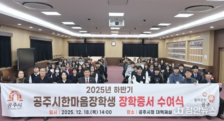 정안뉴스 황도연 기자 | (재)공주시한마음장학회(이사장 최원철)는 지난 18일 시청 대백제실에서 2025년 하반기 장학생을 대상으로 장학증서 수여식을 열었다고 밝혔다.
