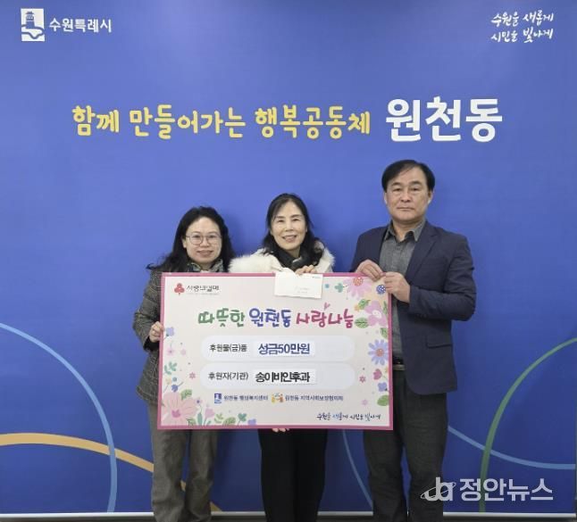 정안뉴스 안정주 기자 | 지난 18일, 원천동에 소재한 송이비인후과는 지역사회 나눔 실천의 일환으로 원천동행정복지센터에 성금 50만 원을 기부했다.