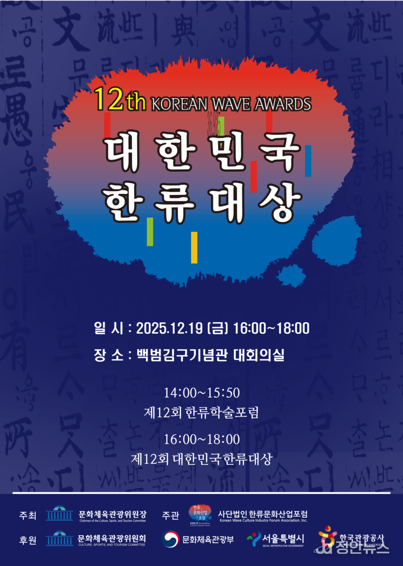 시상식에 앞서 이날 오후 2시부터 3시 50분까지는 ‘제12회 한류학술포럼’이 함께 개최되어, 한류 문화·산업·콘텐츠의 현재와 미래를 조망하는 논의의 장이 마련된다.